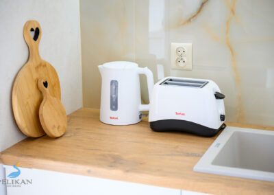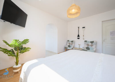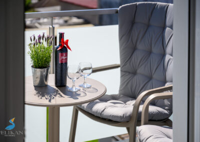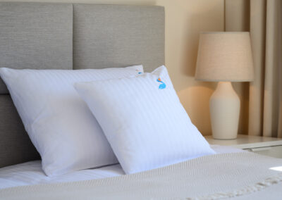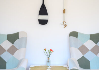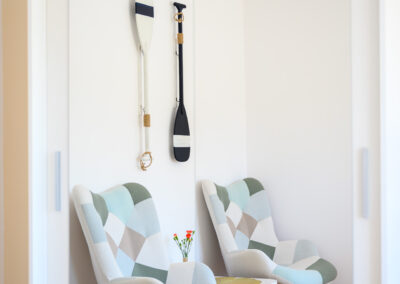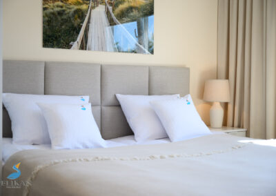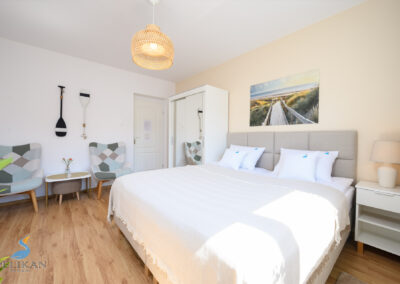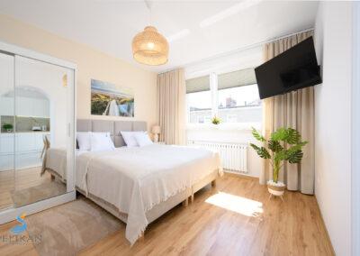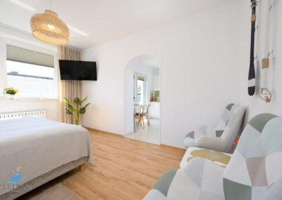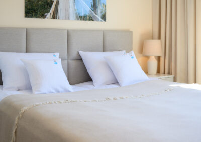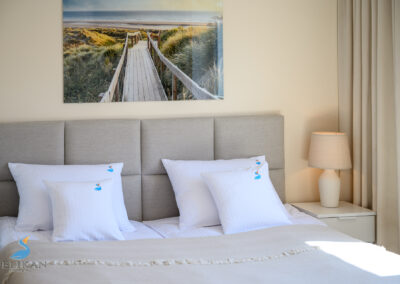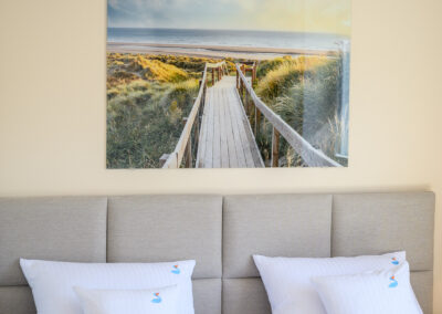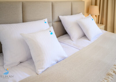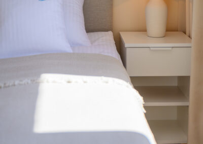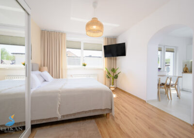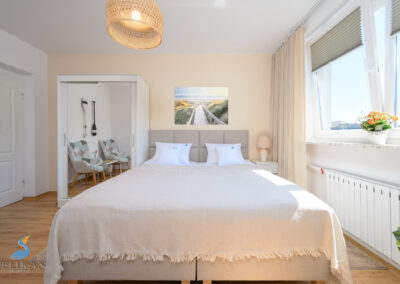 2 łóżka hotelowe, kontynentalne z możliwością łączenia w łoże małżeńskie, szafka nocna, szafa, stolik kawowy, pufa, dwa fotele;
