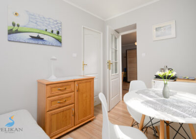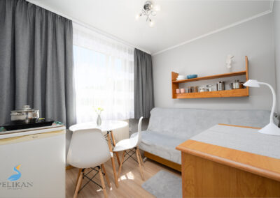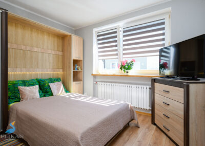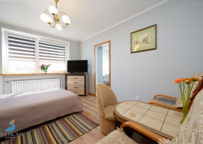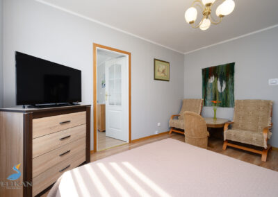 • łoże małżeńskie (półkotapczan), wersalka, szafa, komoda, TV;